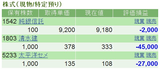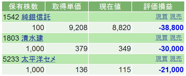 3/16 (-8.9万)-8.9万 どうして銀が下げるのかよく分からない。 (銅ならまだしも、銀なんかいらんから?) 日経平均は488円戻して9093円で大台回復。 それにつられてか清水建設と太平洋セメントがちょっと戻した。 しかし、昨日が底のわけがない。 5000円台まで行くなんていう説もある。 阪神大震災のあとは25%下げて、年末には元に戻っていたという。 なら、7500円までは過去の歴史どおり。 しかし、被害の大きさは桁違い。 あながち5000円んというのも突飛ではない。 となれば、ここで買い増しする馬鹿はいない。 とりあえず来週の水曜午前中は休みを取っているから(通院のため)、 そこらでもう一回考えよう。 ジム・ロジャーズは底値をじっと待つMarch 16, 2011 Japan Disaster Strengthens Case for Commodities Latest CNBC video interview, March 15 東京、神奈川、栃木も被爆3/15購入:純銀信託、清水建設、太平洋セメント見てのとおり、防げたミスで1日で-7.4万。 さあ、来週にはもっと下げているだろう。 狙っていこう。 稼ぐぞ! 日記より↓ 成り行き注文したばかりに一日で-7.4万円: 仕事に気を遣って、場中に注文すればいいものを 明日もさらに下げるぞ! 3/15のニュース福島第一原発は結局1,2,3,4号機ぜんぶ爆発。 横浜のいとこのところまで放射能とんだil||li(つω-`。)il||li 静岡でも震度6but そこの原発は無事。 今も余裕で稼働中。 そして日経平均は-1015円は史上3位の大幅下げ。 現在8605円なり。 たいへんだぁ~ 3/14昼のニュース(3/11東日本大震災後、初の週明け):3号機建屋爆発/保険金2.8兆円か/日銀12兆円資金供給昼のニュースより http://www.jiji.com/jc/c?g=soc_30&k=2011031400385 3号機建屋も水素爆発=福島第1原発-保安院経済産業省原子力安全・保安院によると、東京電力福島第1原発3号機の建屋で14日午前11時1分、爆発が起きた。保安院によると、水素爆発と みられ、原子炉格納容器が 爆発した可能性は低いという。 東電は、11時15分現在、3号機の格納容器と圧力容器は健全と発表した。 保安院は同原発の半径20キロの住民に屋内退避を要請。風向きは南から北で、20キロ 圏内には約600人が範囲内に残っているとみられるとい う。 同原発では12日、1号機が水素爆発を起こし、原子炉建屋上部が破損している。 (2011/03/14-11:36) そして、前場は東芝 -16% 日本製鋼所は -18% ひぃ~ ------------------------------------------------- http://www.47news.jp/CN/201103/CN2011031401000302.html 保険対象、最大2・8兆円 震災では過去最悪か【ニューヨーク共同】米リスク管理会社AIRワールドワイドは13日までに、東日本大震災に伴う保険対象の損失額が最大2兆8千億円に 上るとの試算を発表した。震災による支払 総額として過去最大規模になるとみられる。 ロイター通信によると、2010年の世界の災害による保険金の総額に匹敵。1994年に AIRは、被害を受けた家屋や家財などの損失のうち保険対象は1兆2千億~2兆8千億円 日本損害保険協会によると、阪神大震災の地震保険の支払総額は783億円だった。 ぷぎゃ~ ------------------------------------------------- 日銀、即日資金供給を12兆円に拡大 市場安定期す 日銀は14日午前、金融市場に対し、5兆円規模の緊急資金供給を追加で実施すると 資金の供給期間は3月14~15日。1回目の即日供給では、日銀が金融市場に 東日本巨大地震で各金融機関が資金運用に消極的になり、市場が資金不足に 福島原発実はやばい、とCNN/株買うならこの辺り?中原圭介の板より CNNでは日本人は真実を知らされていないと原子力専門家が明言。 福島はスリーマイルより深刻。 主要報道機関はなぜ真実を明らかにできないのかと米国人から問い質される始末、だって。 ----------------------------- ひとしきり下げるだろうが、上がるかもなのは、 津波関連 6709 明星電気 気象観測・防災装置メーカー 東南アジア地域の各国政府から津波対策引き合い増加中(四季報がオススメ) 6632 ケンウッド 子会社J&K ビジネスソリューション 地震・津波情報を早く正確に受信する&地震津波参集システム 7004 日立造船 平成22年度全国発明表彰発明賞受賞 津波検知システム 災害軽減に大きな効果が期待 1954 日本工営 スマトラ地震(津波)で一番上がった株 9764 技研興業 消波ブロックの型枠レンタルが主力 太平洋セメント 住友大阪セメント 旭硝子 日本板ガラス トーヨーカネツ 鹿島建設 大林組 清水建設 大成建設 福島第一原発責任企業中原圭介の2ch板より 東京電力 福島第一1号 46.0 1971/03 GE GE 東京電力 福島第一2号 78.4 1974/07 GE GE/東芝 東京電力 福島第一3号 78.4 1976/03 東芝 東芝 東京電力 福島第一4号 78.4 1978/10 日立 日立 東京電力 福島第一5号 78.4 1978/04 東芝 東芝 東京電力 福島第一6号 110. 1979/10 東芝 GE/東芝 Nightmare Alley2週間で791アクセス(434名)いやぁ、こんなにたくさんの人に読んでもらえるとは... 初投稿の2/27から昨日3/12までで791アクセス。 訪問者数は434名。 石井先生のおかげだ。 コールドリーディングと出会って約6年。 いいタイミングでナイトメア・アリーと出会えた。 http://ameblo.jp/takasannasakat/ 初めて翻訳したダグラス・ケネディの The Woma