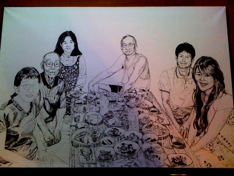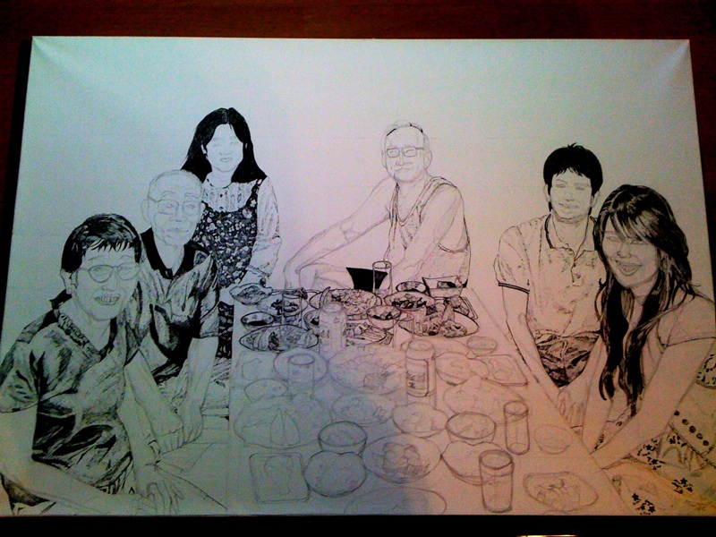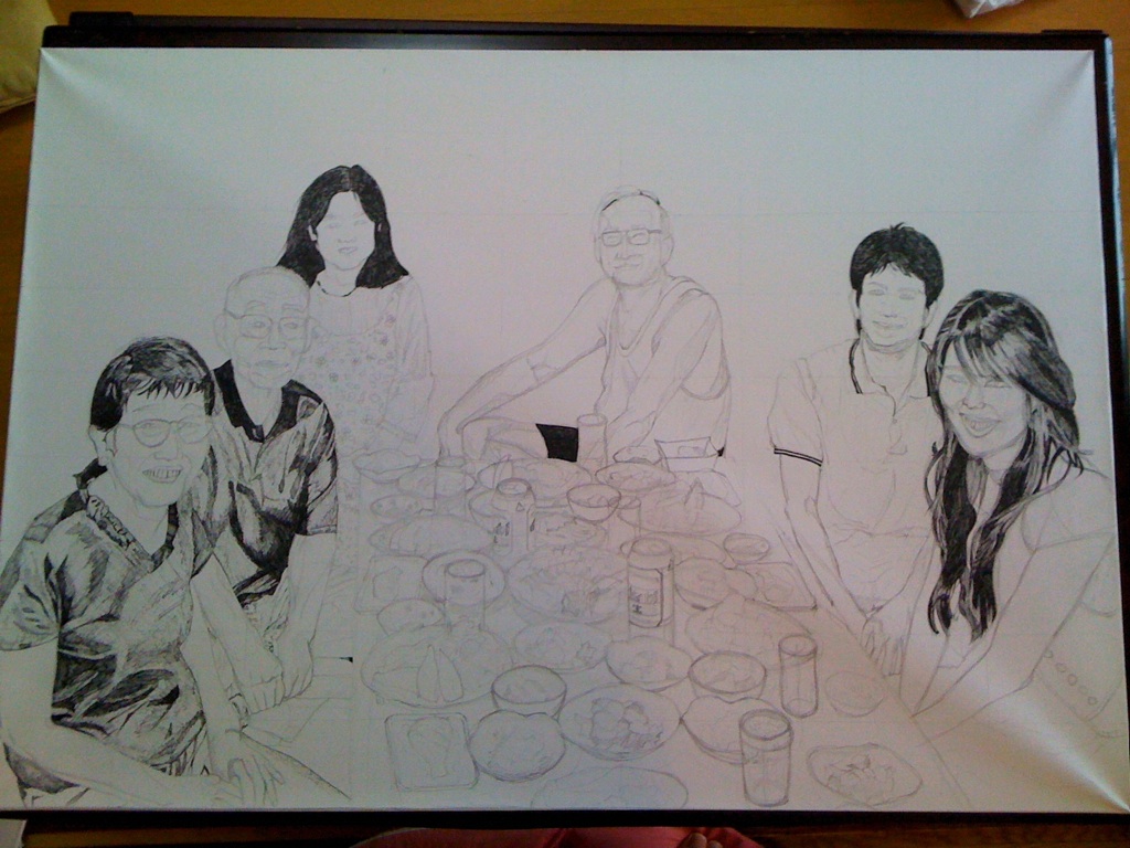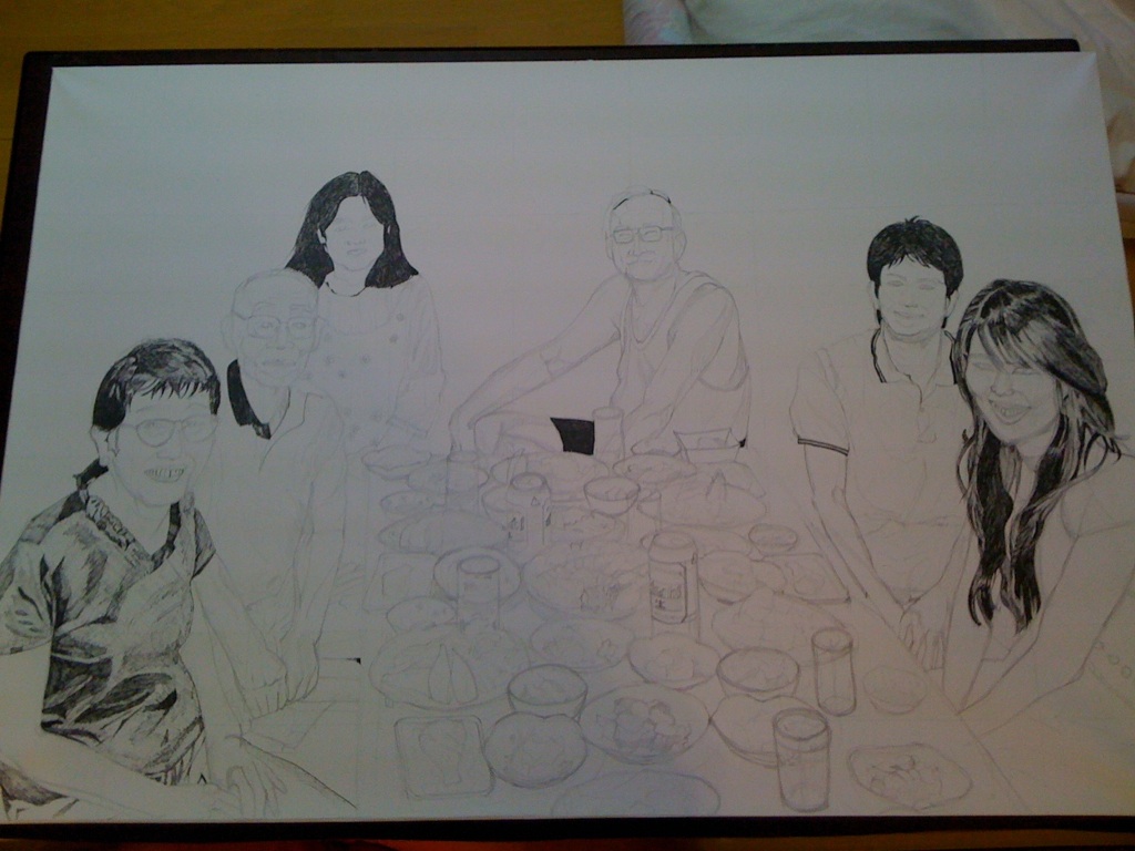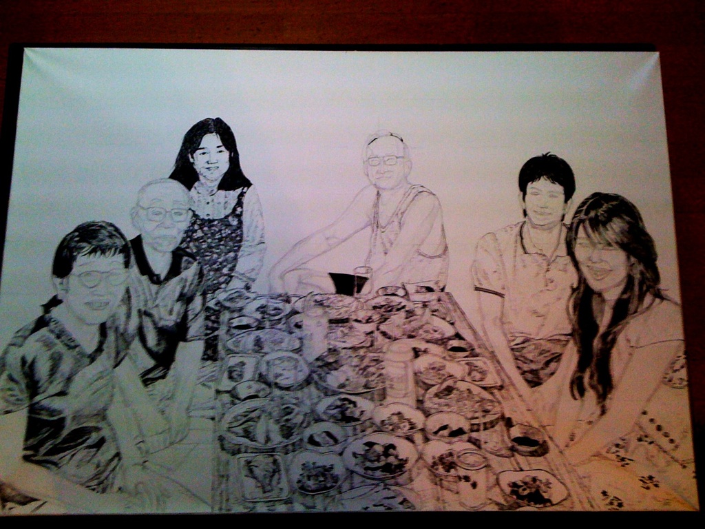 おい、お前には、大切な人がいるか。 そいつにいいことがあったら、自分も幸せになっちまうような。 この時代、大切な人がいない人間が多すぎる。 何も背負わず、身軽になって、それで強くなったと、失うものは何もないと、 強くなった気でいやがる。 でも、それはちがう。そんなんじゃ、だめだ。 ↑ ワタシ、超身軽:(;゛゜’ω゜’): 13日目:料理完了今日は有給休暇を申請していた。 テーブルの上の料理を描き終えた。 ビールと、食器の下の影、テーブルは後回し。 次はテーブルと食器の影を描く。 ビールも描く(こいつがややこい)。 腕も描かんとな。 そこまでは作業に近い。 料理と服は画面の8割を占めるが、 そんなに大事じゃない。 最も重要なのは、6人の表情。 家族の温かい雰囲気が描けるかなぁ... 他) 映画『悪人』見た! いいねぇ 12日目:後半間に 飯、 風呂、 外出、 飯、 風呂、 キングオブコント2010(キングオブコメディの1発目おもろすぎ) をはさんでいるが、 朝8時から夜12時までなんだかんだで絵の作業をしていた。 少なくとも6-7時間は描いてたな。 11日目として貼った写真も実際は今日の午前中の作業だ。 明日の完成は無理! 完成予定日は10月3日に変更。 さあゆっくり進めていこう。 12日目:途中経過ひろゆきがAKBを語る『よく見るとやばいですよ!!』 グッジョブ 綾香じゃなくてSuperflyだった件(ミクシィより。絵描いてる途中の日記から) 一応、全体のバランスも 考えながら 影はつけているんだが、 気をつけないとえらいことになることがある すべてはバランス(ノД`)・゜・。 YOUTUBEで綾香の曲を流しっぱなしにして作業した。 話は変わるが... 「やっぱりこの『綾香』って姉ちゃんは歌うめぇなぁ」 と思っていた曲のほとんどが Superfly でした よく聞くと綾香のほうが声がソフトで、 Superflyのほうが「おらおらぁ、どやさぁ~」な感じが強いのか。 どっちも好き。 昔、ヒステリックブルーの「春」を聞いて Judy & Maryの新曲だと思ったり、 宇多田の英語の発音ってこんなんだったっけ? でもやっぱりいい声してるなぁって思ったら それが倉木麻衣のデビュー曲だったり、 上手ならそっくりでも大丈夫です。 全然問題ない。 ...堂本剛はミスチルのモノマネがしたいのか?? 11日目:じいちゃんの陰影に10日目:ずんずんペン入れ | |||||||||||||