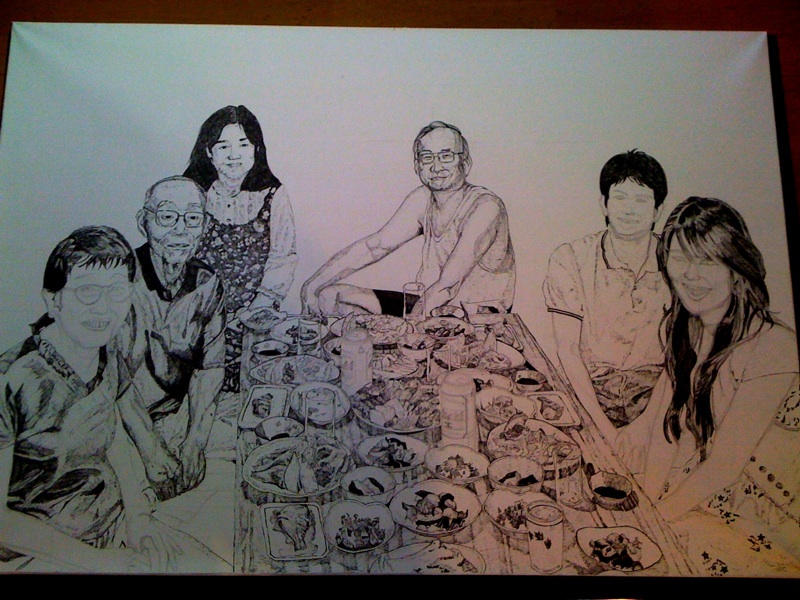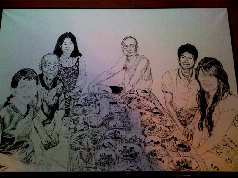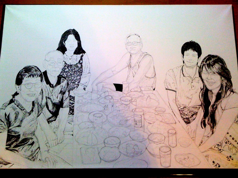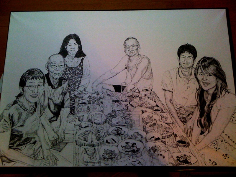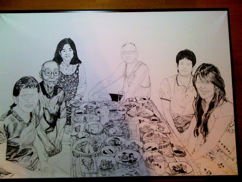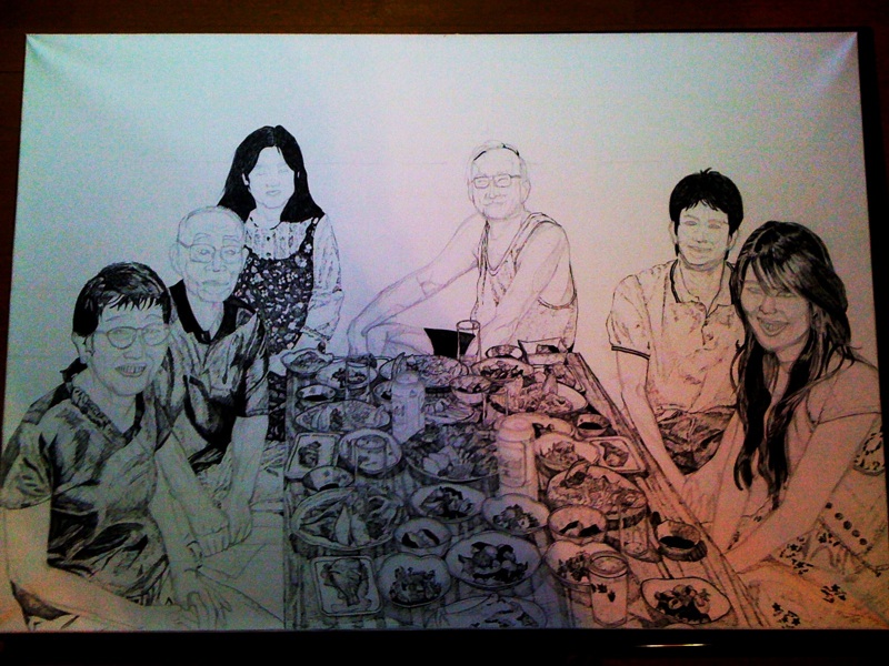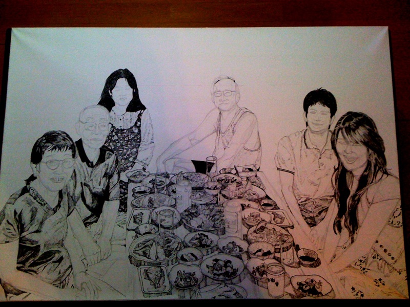 おい、お前には、大切な人がいるか。 そいつにいいことがあったら、自分も幸せになっちまうような。 この時代、大切な人がいない人間が多すぎる。 何も背負わず、身軽になって、それで強くなったと、失うものは何もないと、 強くなった気でいやがる。 でも、それはちがう。そんなんじゃ、だめだ。 ↑ ワタシ、超身軽:(;゛゜’ω゜’): 13日目:料理完了今日は有給休暇を申請していた。 テーブルの上の料理を描き終えた。 ビールと、食器の下の影、テーブルは後回し。 次はテーブルと食器の影を描く。 ビールも描く(こいつがややこい)。 腕も描かんとな。 そこまでは作業に近い。 料理と服は画面の8割を占めるが、 そんなに大事じゃない。 最も重要なのは、6人の表情。 家族の温かい雰囲気が描けるかなぁ... 他) 映画『悪人』見た! いいねぇ 12日目:後半間に 飯、 風呂、 外出、 飯、 風呂、 キングオブコント2010(キングオブコメディの1発目おもろすぎ) をはさんでいるが、 朝8時から夜12時までなんだかんだで絵の作業をしていた。 少なくとも6-7時間は描いてたな。 11日目として貼った写真も実際は今日の午前中の作業だ。 明日の完成は無理! 完成予定日は10月3日に変更。 さあゆっくり進めていこう。 12日目:途中経過ひろゆきがAKBを語る『よく見るとやばいですよ!!』 グッジョブ 綾香じゃなくてSuperflyだった件(ミクシィより。絵描いてる途中の日記から) 一応、全体のバランスも 考えながら 影はつけているんだが、 気をつけないとえらいことになることがある すべてはバランス(ノД`)・゜・。 YOUTUBEで綾香の曲を流しっぱなしにして作業した。 話は変わるが... 「やっぱりこの『綾香』って姉ちゃんは歌うめぇなぁ」 と思っていた曲のほとんどが Superfly でした よく聞くと綾香のほうが声がソフトで、 Superflyのほうが「おらおらぁ、どやさぁ~」な感じが強いのか。 どっちも好き。 昔、ヒステリックブルーの「春」を聞いて Judy & Maryの新曲だと思ったり、 宇多田の英語の発音ってこんなんだったっけ? でもやっぱりいい声してるなぁって思ったら それが倉木麻衣のデビュー曲だったり、 上手ならそっくりでも大丈夫です。 全然問題ない。 ...堂本剛はミスチルのモノマネがしたいのか?? 11日目:じいちゃんの陰影に10日目:ずんずんペン入れ | |||||||||||||