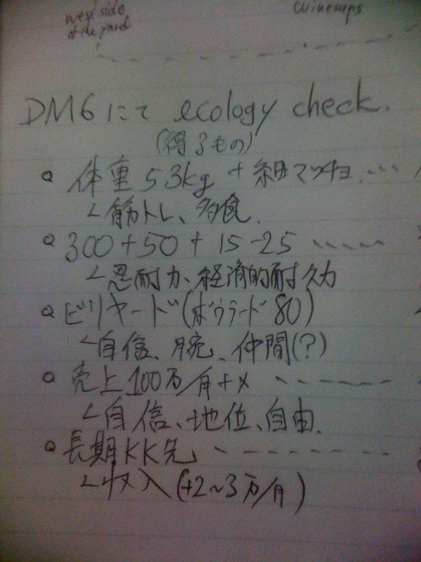 1-4-4 50行って、筋トレす疲れた。 新しい人が3人来るというぷれっしゃー。 久しぶりに2ヶ月以上ひとつの職場にいるプレッシャー。 戦おう。 現状維持メカニズムが自分を引き戻そうとしても、この会社にいよう。 気がつけばレアに1-4-3 53 with passion53で時間切れ。いいさ! さぼっちゃいない!! 早く次の売るぞぉ 1-4-2 やってます筋トレした! 昨日もちゃんとやった! Fake it until you make it. びっくりどら焼GPシリーズ中国杯:鈴木、織田がV鈴木明子やったー!!男子は織田が取ったー!! 買っちゃった2004年以来か、アーミーナイフをもつのは。 便利なんだよ、こいつは。 今回買ったのは、プラスとマイナスのドライバーが入っている。コピー機 屋にピッタリ。もちろん、カッターがわりのナイフ、のこぎり、栓抜き、 糸通しもついている。脱獄だってできるかもしれない。 コピー機の絵コピー機の絵を描いていたが、アップロードしていなかった。 プリントTシャツ屋さんと、貿易会社に、合計3台売った。 今月はすべてカラーコピー機か。 ええこっちゃ。 1-3-6 お休み 土曜はサボリの日。しかし、ねたはみつけたー! 10月終了。 1845500円で売上トップ。 係長絶不調による。 3ヶ月連続達成は可能か? とにかくやりまひょ 1-3-5 50行った、118.77決まった、売上184.55万売れた~ 目標(150万)クリアー 懸垂も125回。うっしゃぁ 1-3-4 50クリア、もう1ケ売れるどうやらもう1件売れたらしい。明日、社長が書類を作りにいく。 明日で今月の平日も終わり。頑張ろう。 1-3-3 50件決まった、65.78pt決まった、ネタも出たしゃーこらっ 今月1台目~ かもん。 目標設定1-3-2 50クリア with passion先週は50件回ることに集中した。それができるようになって、今度はそれに感情を、積極的に乗せるようにした。 何も売れなかったが、3件引っかかってアウトになった。大進歩。 そして、筋トレもいい感じ。懸垂125回。前回の筋肉痛がまだ残っていたが、中断しつつやり直すを何回かはさんだのが前回。今回は、中断なし。5,10,15,20,25,20,15,10,5でやりきった。 これは筋肉つくぞぉ。 6ヶ月プログラムの目標も、そろそろ作るか。 エコロジー・チェックは確かに大事。 みっつを服の中に1-3-1 50ok50件回った。明日は感情を込めて50件回る。 Plushenko's back!!プルシェンコが戻ってきた。 かっこよすぎ!! 2位の小塚も頑張った!GPシリーズ・ロシア大会。女子は安藤が優勝。 パリで優勝した織田とあわせて、モロゾフ組がのりにのっている。 佐藤コーチんとこも2位、2位(中野@パリ)といい感じ。 Bailey's finishedこれが新しいパソコンの幕開けだシャープのネットウォーカー。まだ実物を見にいけていない。 おそらく、使いにくいだろう。しかし、この系統の商品がこれから続々と出てくる。 それを買いたい。クァルコムが市場に登場させたsmart bookと同様、3秒で起動し、電池が10時間持つ。 これができて初めて、パソコンが自分の体、脳みその一部となった感覚が味わえる。 紙のノートやメモ帳を開くのと大差ないタイムラグで、パソコンを開くことができたなら、どんなに素晴らしいことだろうか。 俺が欲しいのはこういうPCだ ・重さ1kg以内。500g近辺がベスト ・電池は10時間以上持つ ・起動は3秒以内 ・音が静か ・動画再生に強い ・ネット接続はUQ Wimaxないしはそれ以上の速度 ・オフィスが使える ・USB端子が3つ以上付いている ・タッチパネルが使える ・キーボードが打ちやすい ・サイズは、小型、B5、A4いずれか(重量は1kg以下) 1-2-6、7 一週間お疲れっすー